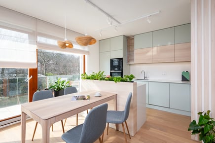 Majitelé se na mě obrátili zhruba rok před kolaudací nového bytu 3+kk. Od developera měli již půdorys a rozepsané jednotlivé fáze stavby. Tím, že začali včas, si zajistili dostatek času na všechny potřebné úpravy – od změn v elektroinstalaci až po výběr vhodných materiálů. Měli i předběžný návrh kuchyně v klasickém provedení - bílá v kombinaci se dřevem. Zaujal je ale návrh v pastelově zelenkavém odstínu. Tento odvážný krok zcela proměnil atmosféru bytu. Pastelová zelenkavá se stala stěžejním prvkem, který prochází celým interiérem. V chodbě jsem zvolila neutrální béžovou. Kuchyňský ostrůvek jsem ozvláštnila truhlíkem na pokojové kytky nebo bylinky. Výklenek na pračku a sušičku, který je hned naproti vstupu, bylo potřeba ukrýt, protože by to bylo to první, co by člověk při vstupu viděl. Proto jsem navrhla řešení s posuvnými dveřmi, které splývají se stěnou, vymalovanou barvou ve stejném odstínu. Důležitým prvkem návrhu jsou i lamely, které v interiéru plní estetickou i praktickou funkci. Díky průhlednosti umožňují vizuální oddělení jednotlivých zón, aniž by narušily otevřenost prostoru. Obytná plocha: 86 m2 Foto: Vojta Herout