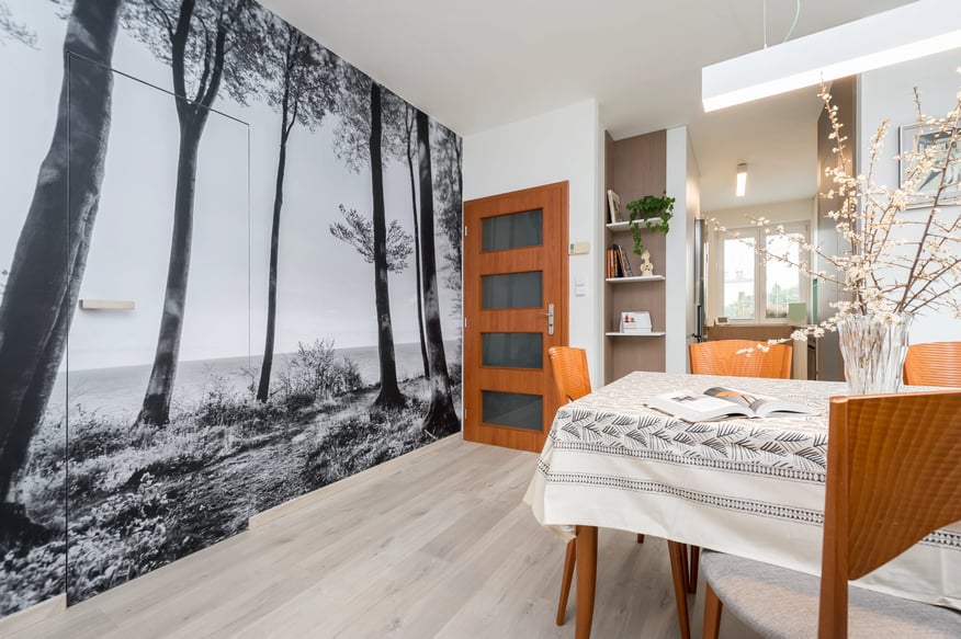 Návrh rekonstrukce přízemí domu po patnácti letech, tedy předsíň, kuchyň, obývací pokoj a pokoj pro dospívající dceru. Majitelka si přála vinylovou podlahu a zachovat původní dveře a jídelní stůl s židlemi. Zvolila jsem tedy neutrální základ v podobě světlého dřeva, teplé šedé a světle hnědé barvy a černobílé fototapety, které zaujmou na první pohled. Tapeta má za úkol dokonale zamaskovat dveře do malé komory. Klasické dveře byly nahrazeny dveřmi se skrytou zárubní. Požadovaný akcent tyrkysově zelené barvy je použit na pohovce a ve formě barevného skla za pracovní deskou v kuchyni. Veškerý nábytek byl vyroben na míru podle mého návrhu. V dívčím pokoji bylo potřeba navrhnout velkou šatní skříň a pracovní prostor, a také novou postel. Pokoj jsem zútulnila použitím výmalby a zajímavé tapety, kterou si dívka sama vybrala. Foto: Vojta Herout